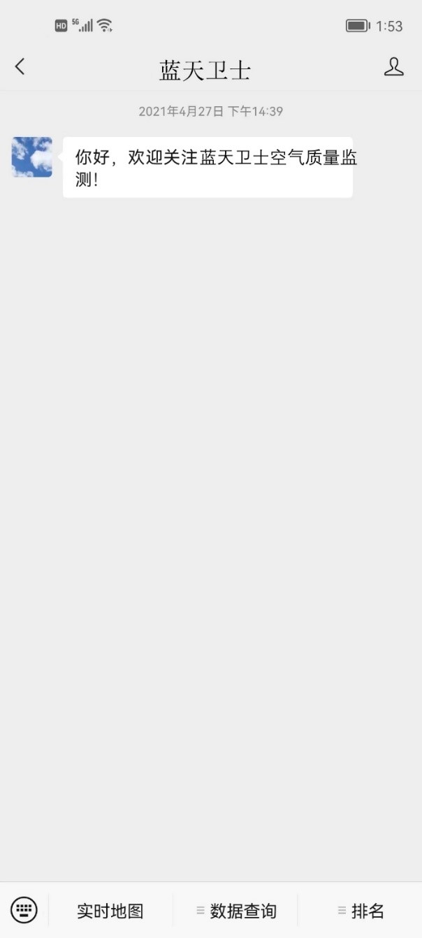 在微信中搜索“蓝天卫士”微信公众号,并加关注,即可查询辖区内乡镇空气质量自动监测站的监测数据。其登录界面如下:
