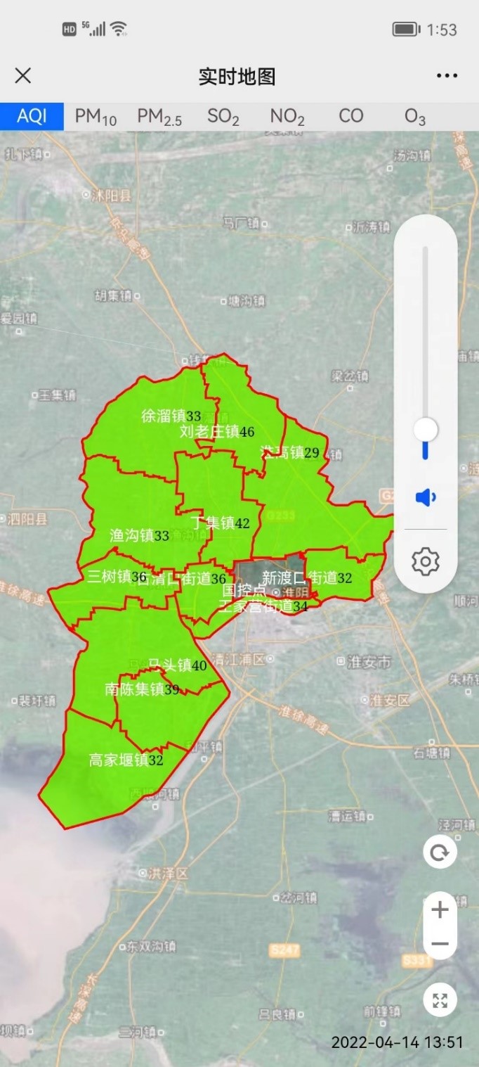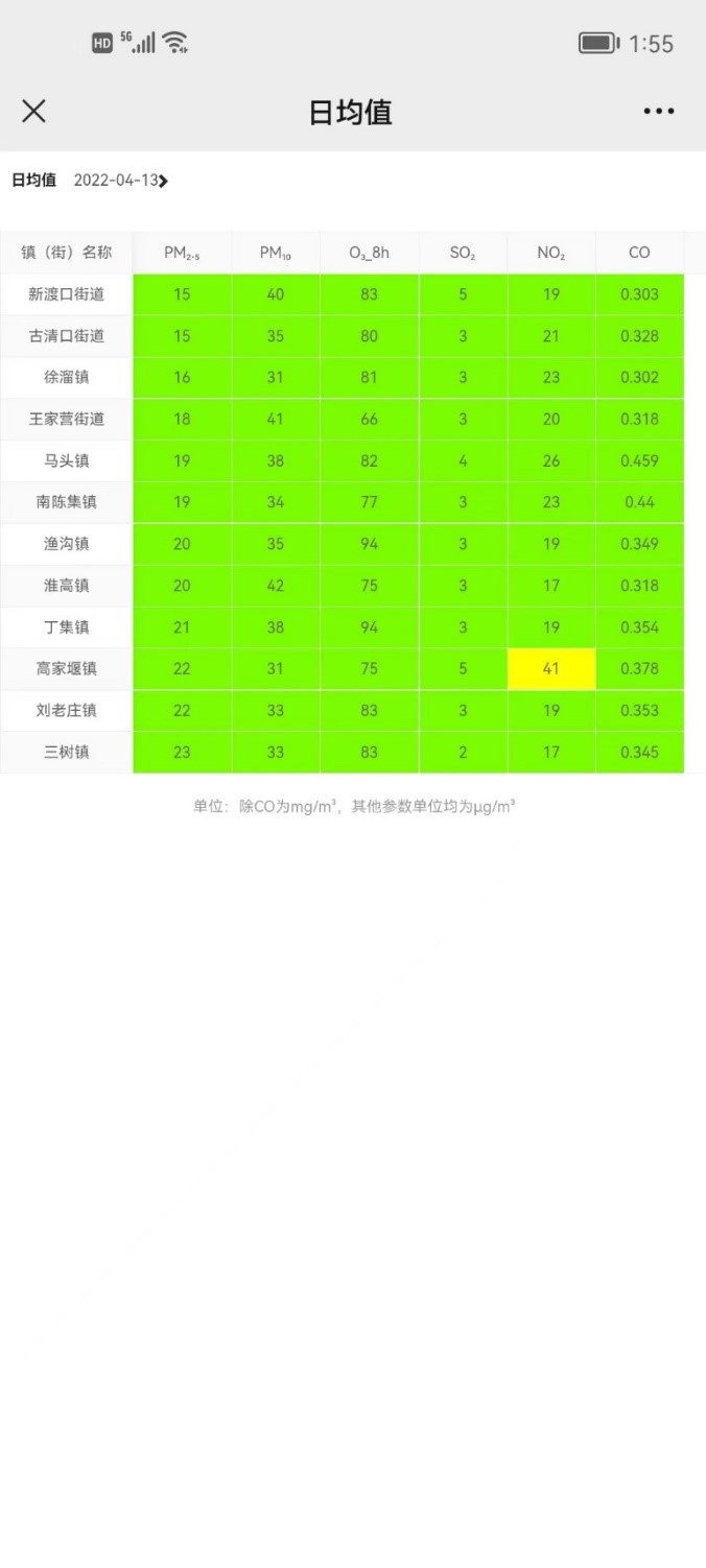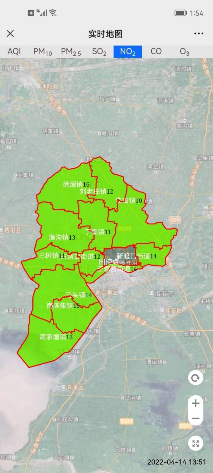 地图上可清晰地呈现12个镇/街的NO2浓度值、浓度分布图。便于用户及时发现监测数据传输、数值大小是否异常。