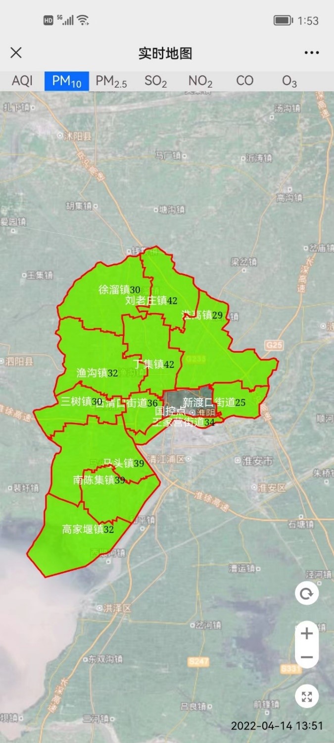 地图上可清晰地呈现12个镇/街的PM10浓度值、浓度分布图。便于用户及时发现监测数据传输、数值大小是否异常。