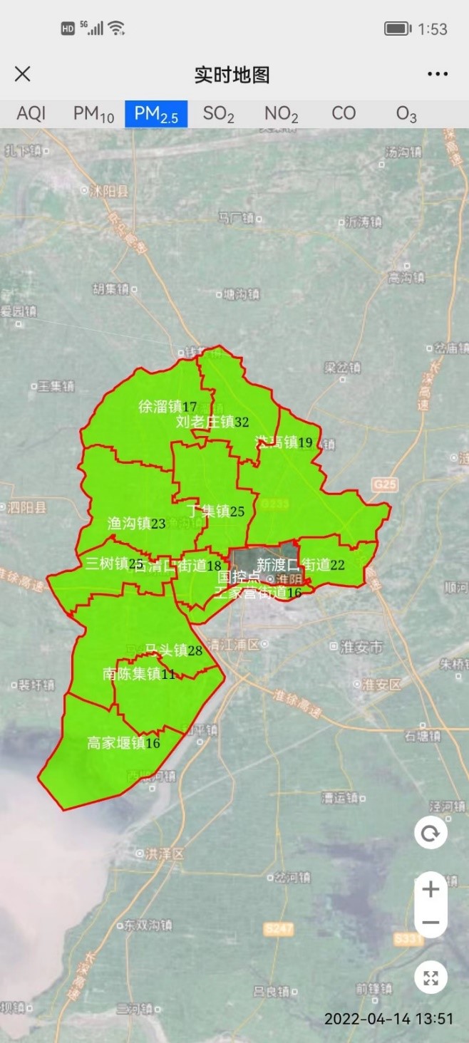 地图上可清晰地呈现12个镇/街的PM2.5浓度值、浓度分布图。便于用户及时发现监测数据传输、数值大小是否异常。