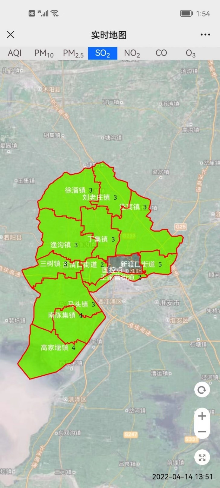 地图上可清晰地呈现12个镇/街的SO2浓度值、浓度分布图。便于用户及时发现监测数据传输、数值大小是否异常。
