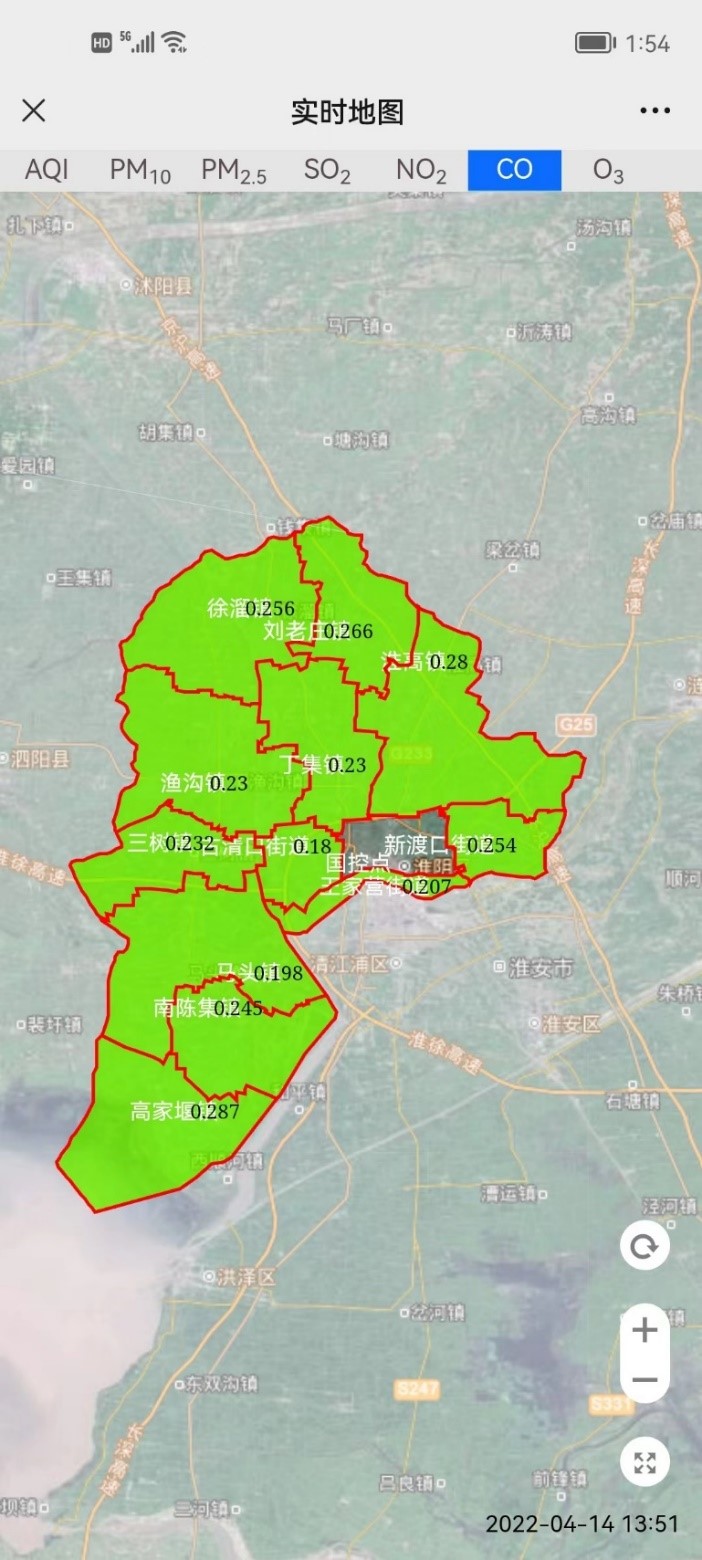 地图上可清晰地呈现12个镇/街的CO浓度值、浓度分布图。便于用户及时发现监测数据传输、数值大小是否异常。