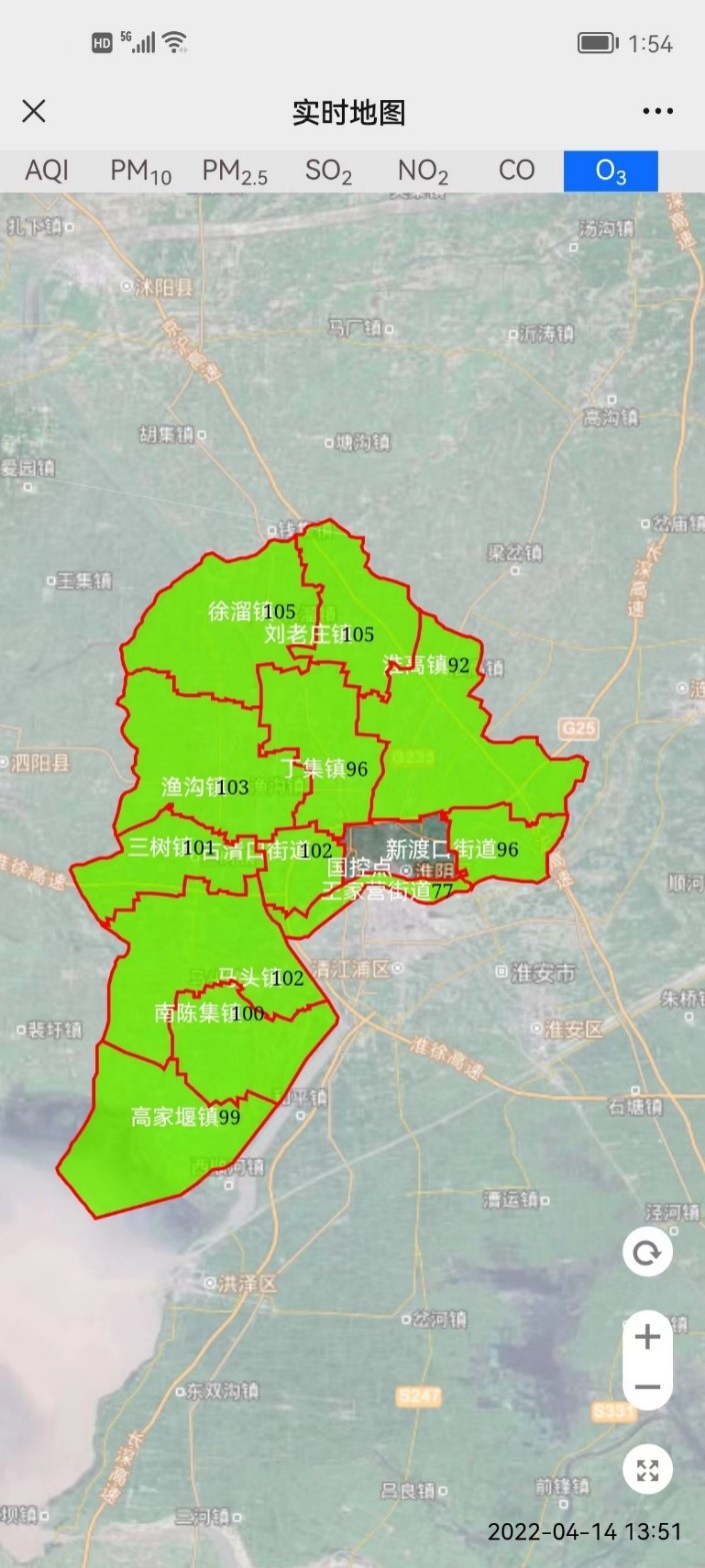 地图上可清晰地呈现12个镇/街的O3浓度值、浓度分布图。便于用户及时发现监测数据传输、数值大小是否异常。