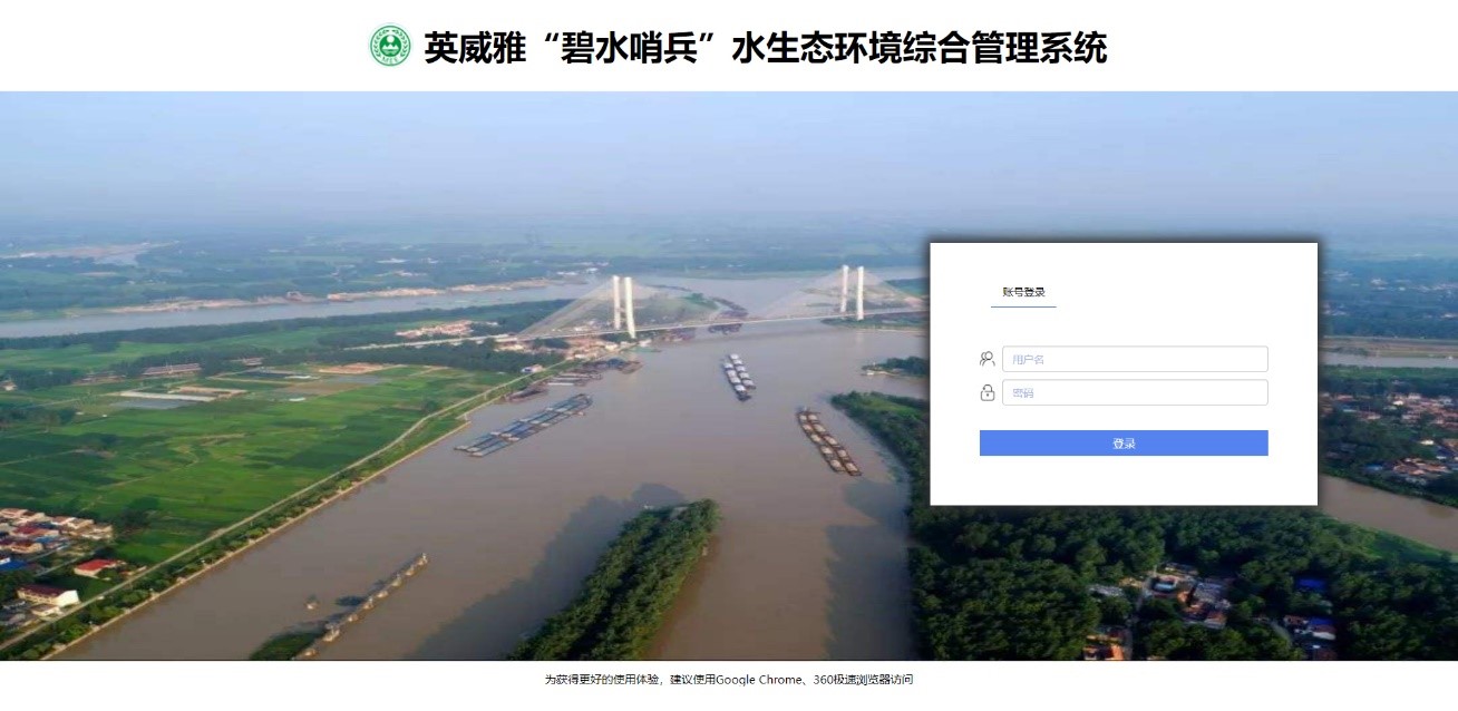 为打好碧水保卫战,改善淮阴区河流水质,落实“受纳水体-排污口-排污通道-排污单位”全链条管理,开发英威雅“碧水哨兵”水生态环境综合管理系统。系统以“查、测、溯、治、管”为主线,其登录界面如下: