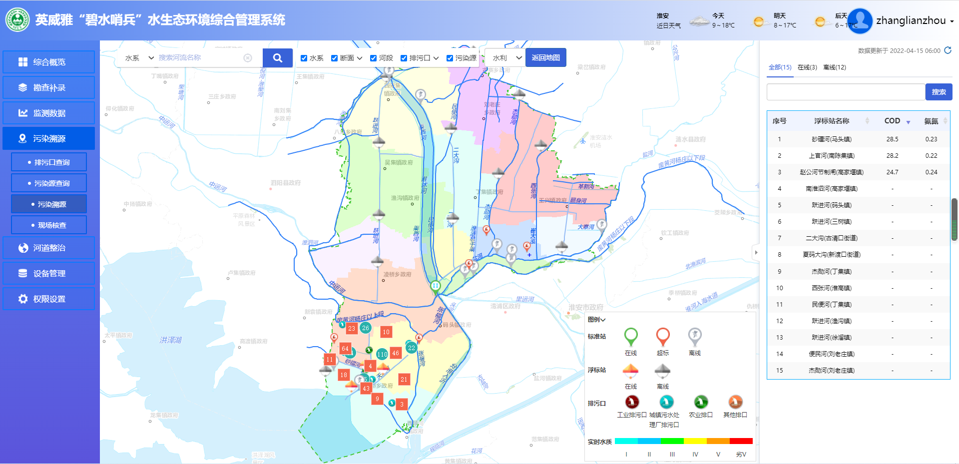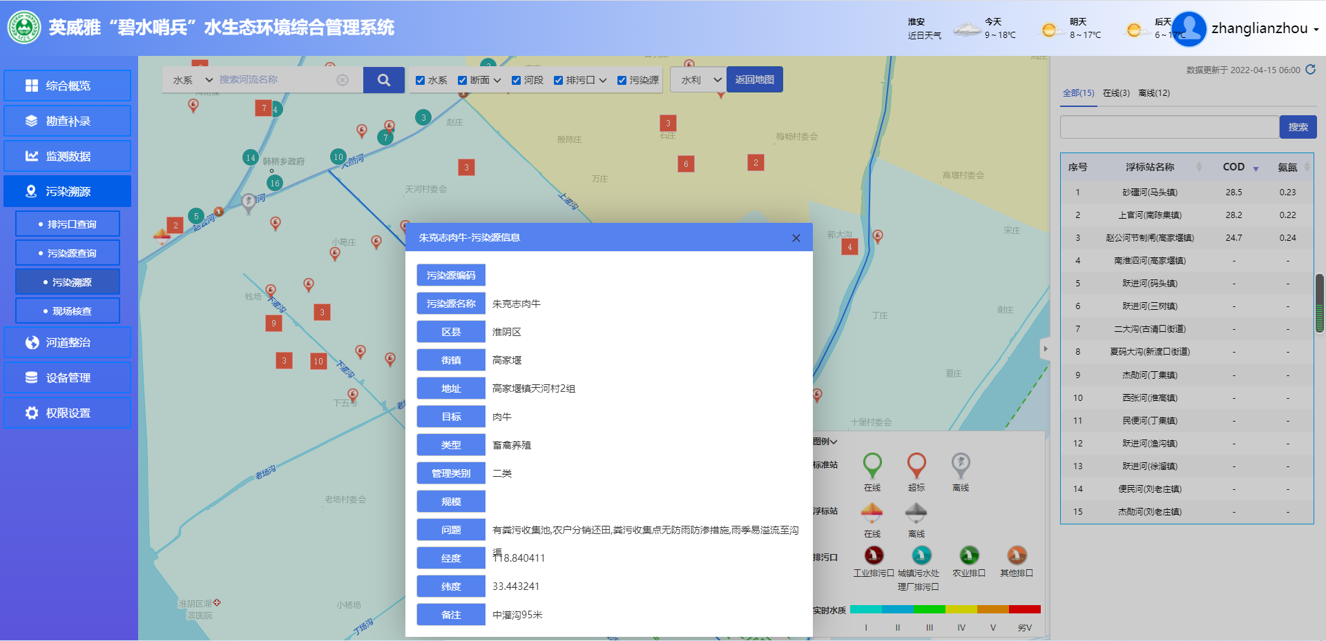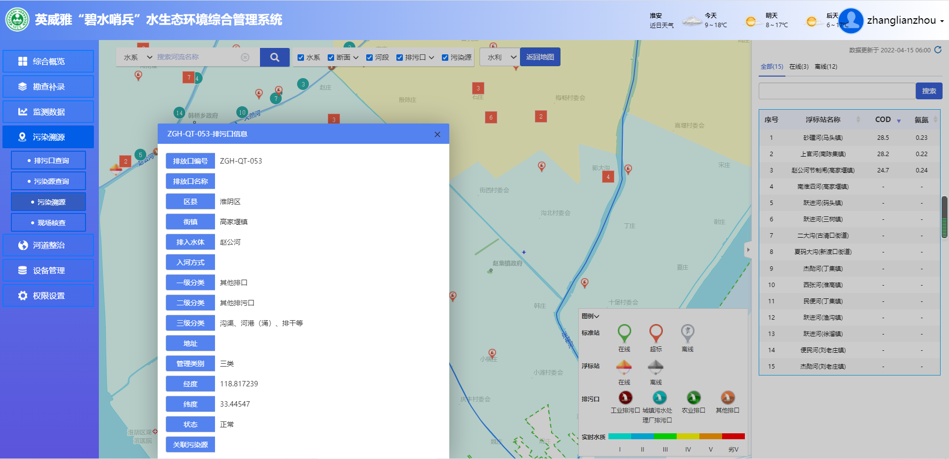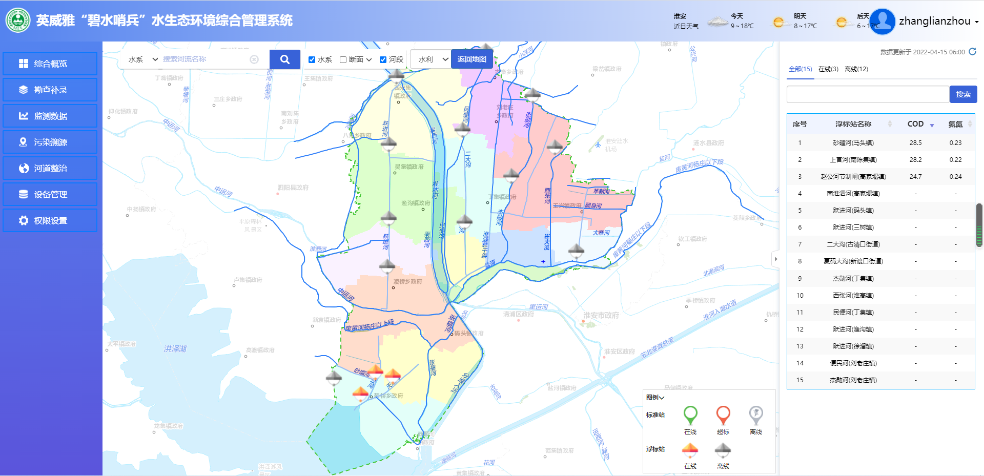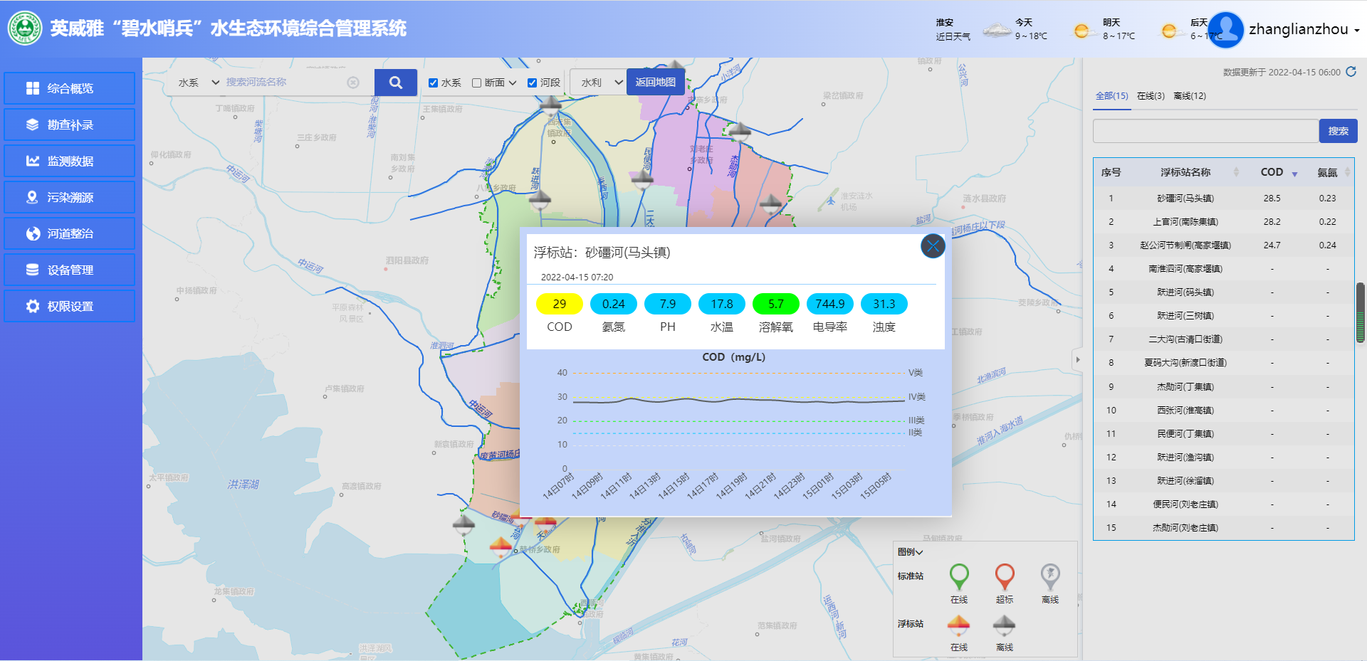 数据列表区对15个浮标主要监测数据,即COD和氨氮,并进行排名,各站点水质优劣一目了然。