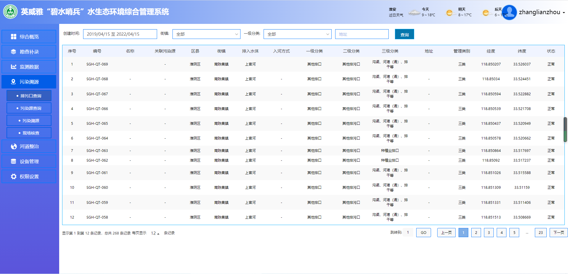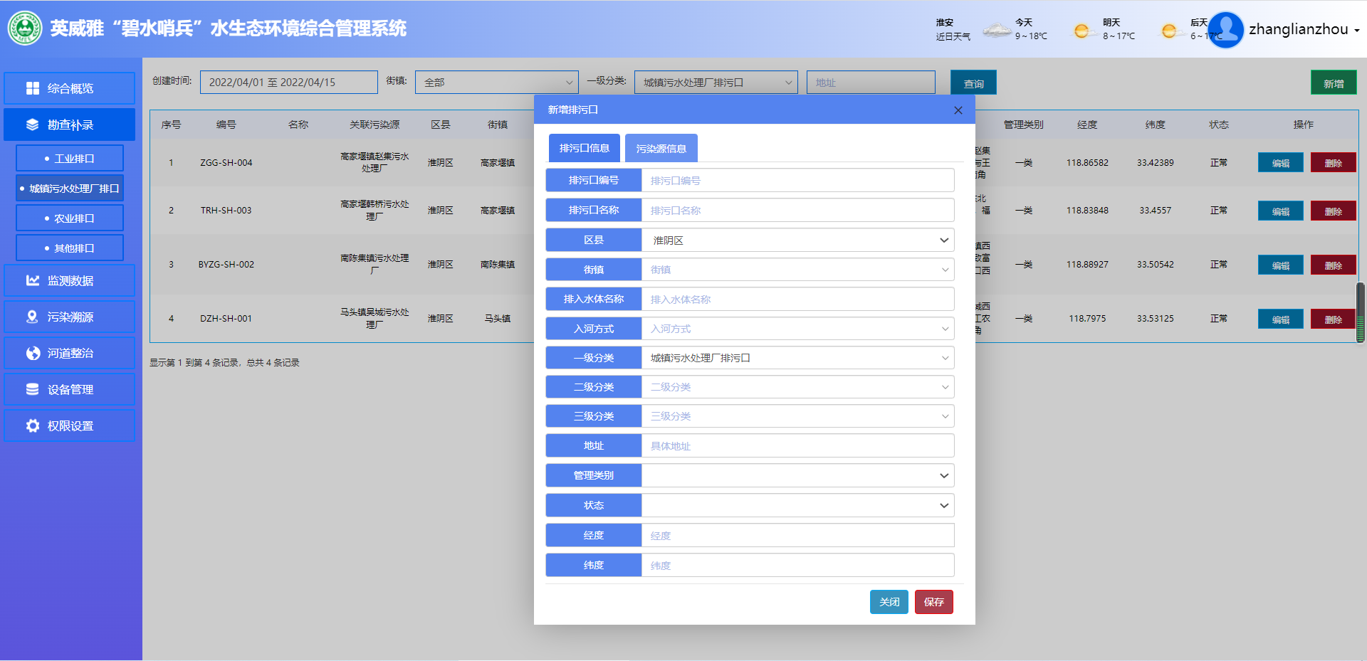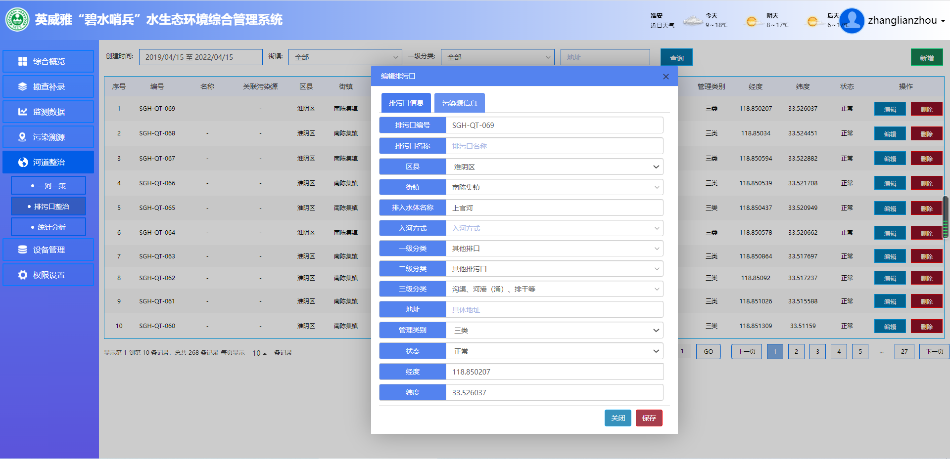 系统针对每个排污口都提供了删除或编辑功能,动态反映排污口的状态,包括取缔、合并、整治等。