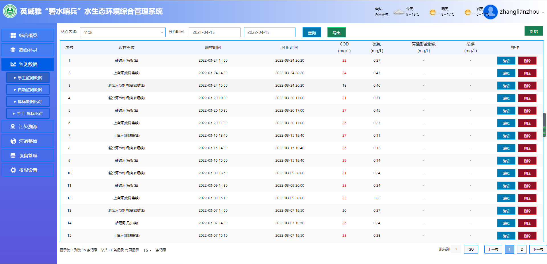 为了检验浮标监测的准确性,需要定期开展手工监测工作并进行比对。系统提供手工监测模块,包括新增、查询、删除、编辑、导出等功能。