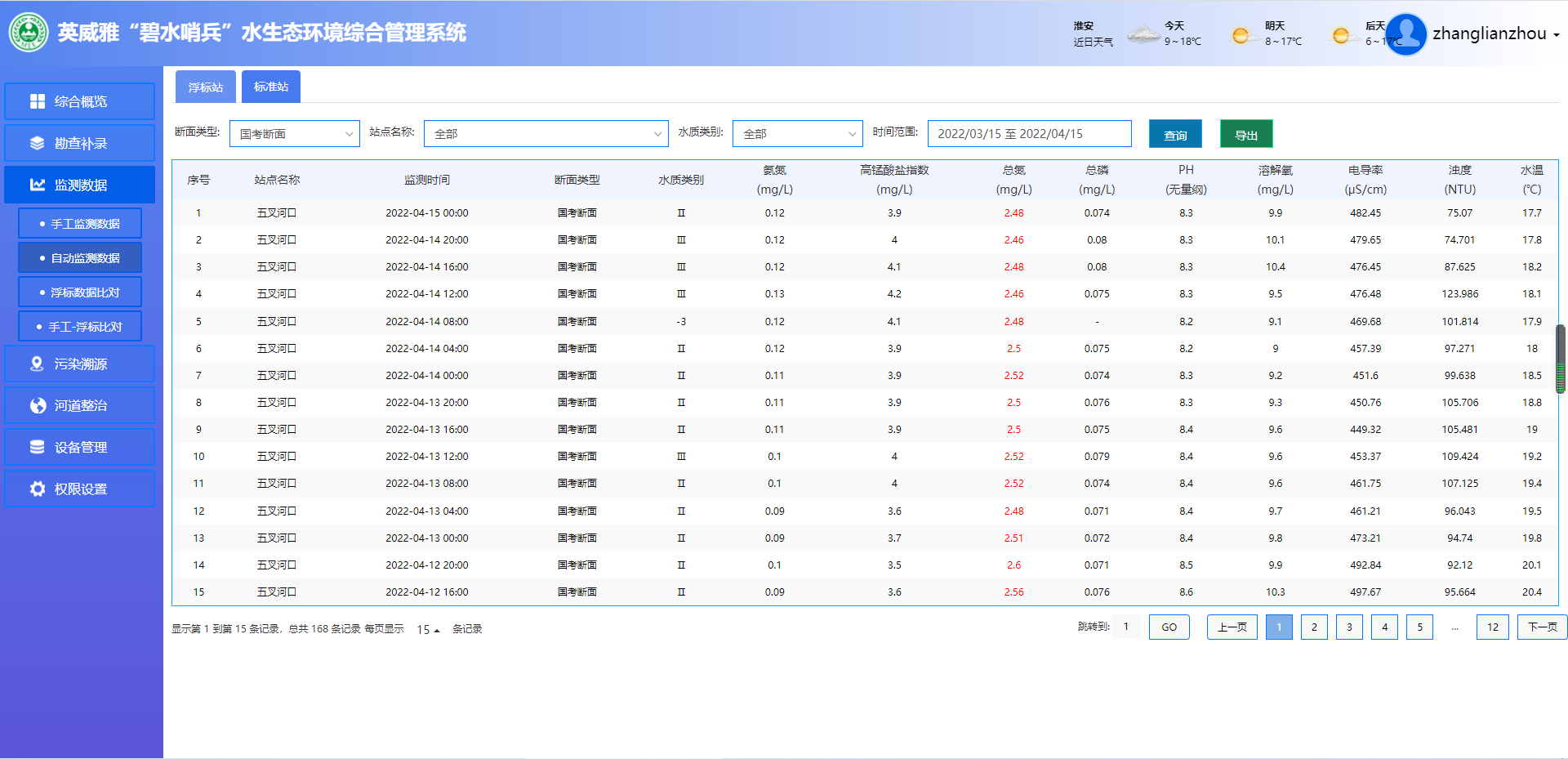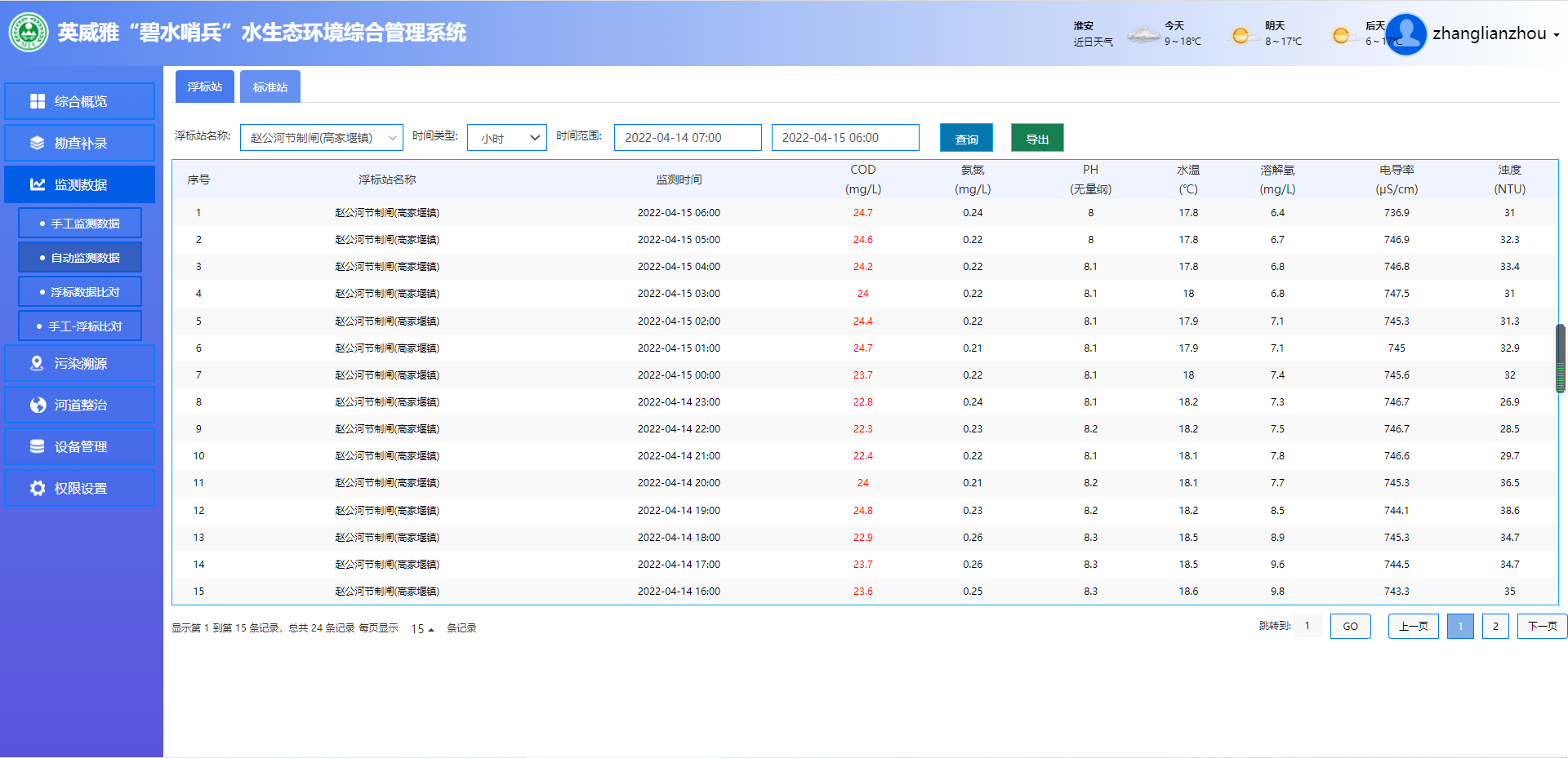 系统提供自动监测数据模块,包括浮标站、标准站的自动监测数据查询、导出功能: