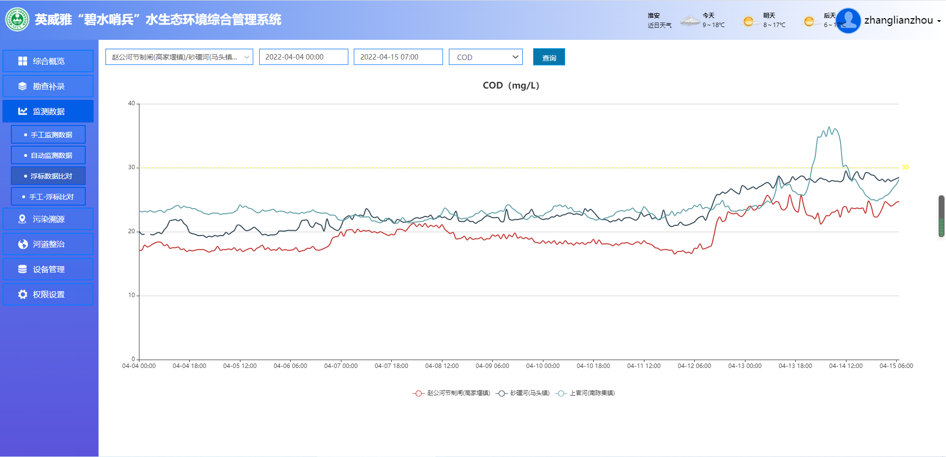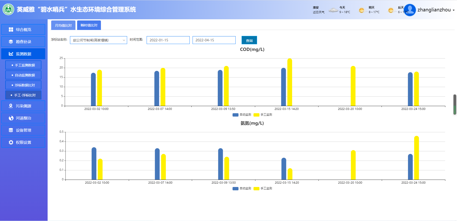 以及浮标监测数据与手工监测数据的比对功能,可直观地呈现二者之间的差异: