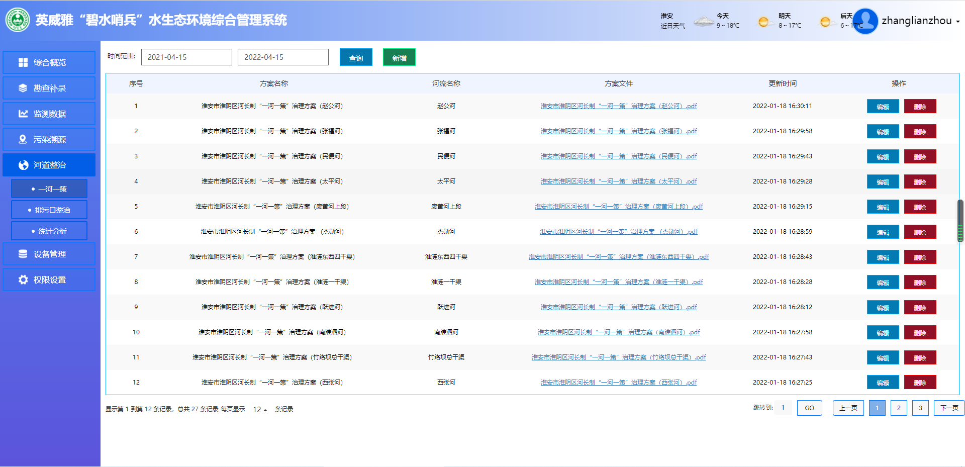 淮阴区已针对辖区内的河流编制了“一河一策”,本系统提供了“一河一策”的查询、浏览等功能。