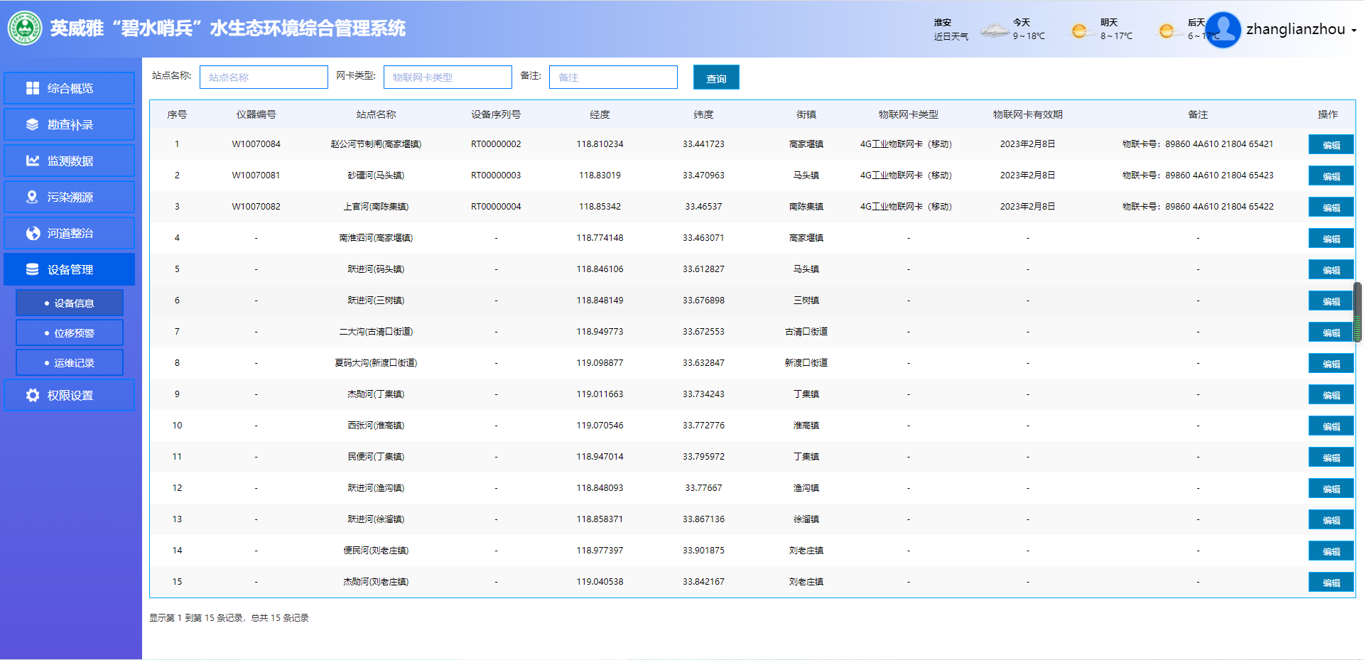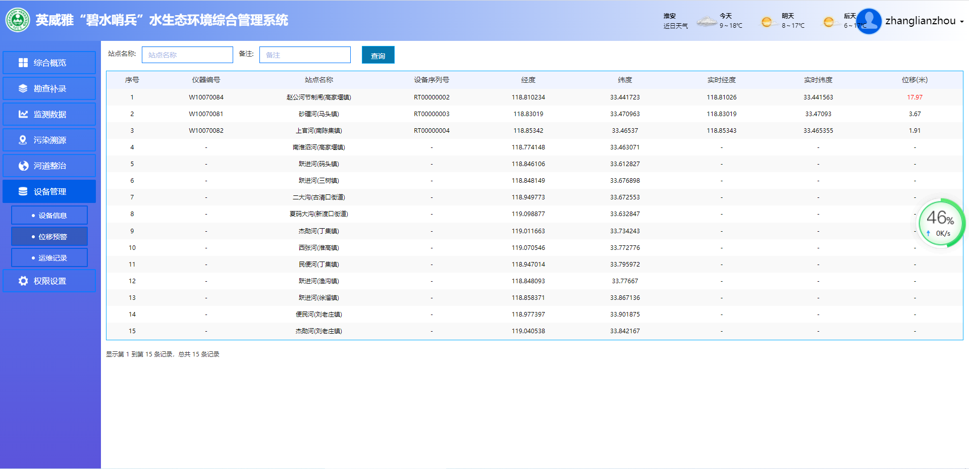 为了确保监测数据准确可靠,需要定期对浮标的传感器进行清理、校准等运维工作。设备管理模块包括设备信息、位移预警、运维记录功能: