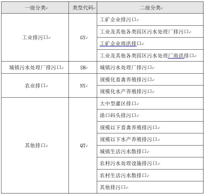 根据排污口责任主体所属行业及排放特征,将排污口分为工业排污口、城镇污水处理厂排污口、农业排口、其他排口等四种类型。